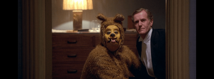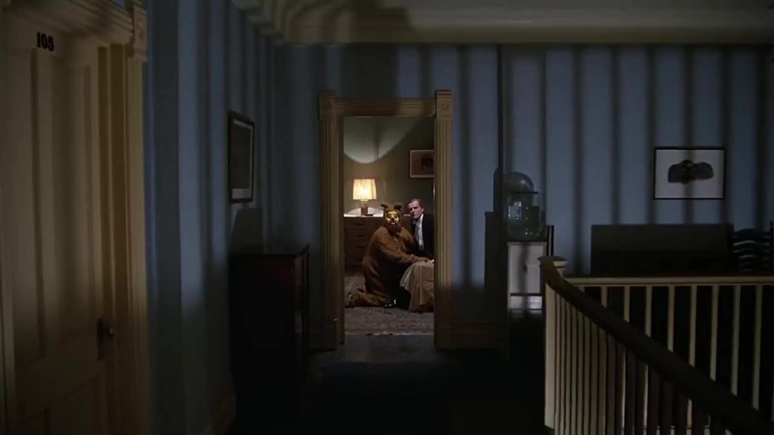 Met fellatio (de beer bij de heer), lees je overal. Ik ben ook geneigd dat te denken, maar is dat daarom zo? Bij Kubrick weet je nooit. Misschien was die heer gewoon die beer z’n kop aan het knuffelen. Eerstgenoemde gaf me in elk geval nooit de indruk alsof ie net gepijpt werd. Maar goed, fellatio of niet, waar die scène dan op sloeg, dat bleef andere koek. In het boek dat Kubrick pretendeerde te verfilmen, Stephen Kings The Shining (1977), komen geen berenpakken voor. (Dat King het nooit begrepen heeft op Kubricks verfilming, is bekend.) En wie maakt hard dat we dat personage in dat berenpak niet moeten interpreteren als een vrouw? Oké, de acteur erin was blijkbaar een man, ene Eddie O’Dea, maar wat zegt dat? Vorig jaar nog interviewde een Nederlander diens medespeler in het herenpak, Brian V. Towns. Leuk om die kwieke man op YouTube bezig te horen én te herkennen, maar wijzer worden we er niet van. Hij en O’Dea verbleven voor die scène twee weken in de Elstree Studios, boven Londen, maar Towns weet na negenendertig jaar nog steeds niet wat zijn scène in de film doet.